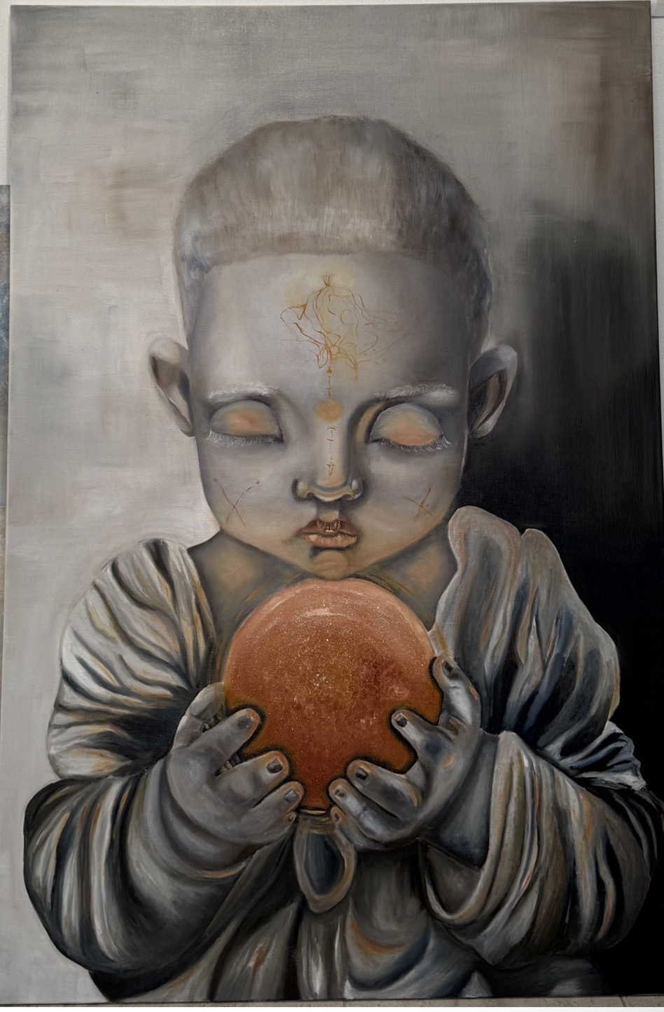 Эта картина — о внутреннем свете, который есть в каждом из нас. Образ ребёнка, держащего в руках сияющий шар, символизирует рождение интуиции, мудрости и духовной силы. Взгляд внутрь себя, мягкое свечение и глубокие оттенки создают ощущение тайны и покоя.